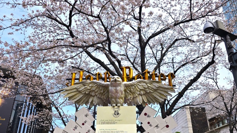 赤坂ACTシアター周辺に広がる「ハリー・ポッター」の幻想的な装いと、瑞々しく咲き誇る桜の共演。都会の真ん中で魔法にかけられたような、特別な春のひとときをお届けします。