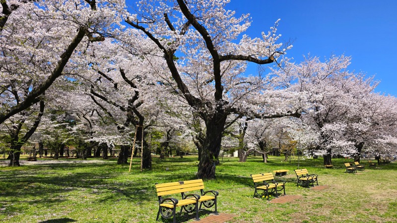 約80ヘクタールという圧倒的な広さを誇る園内には、ソメイヨシノやヤマザクラなど約50種、およそ1,400本から1,700本の桜が植えられています。